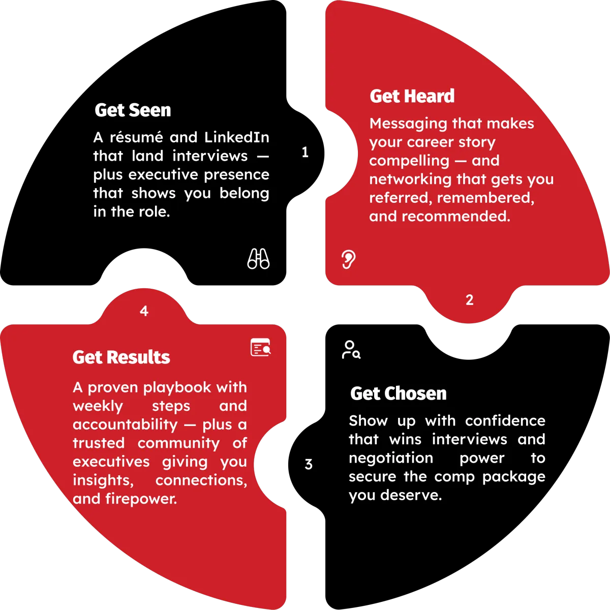 For executives $200k to $1M+ with former executives working alongside you to execute the playbook that delivers clarity, traction, and faster landings with you seen as the obvious choice.